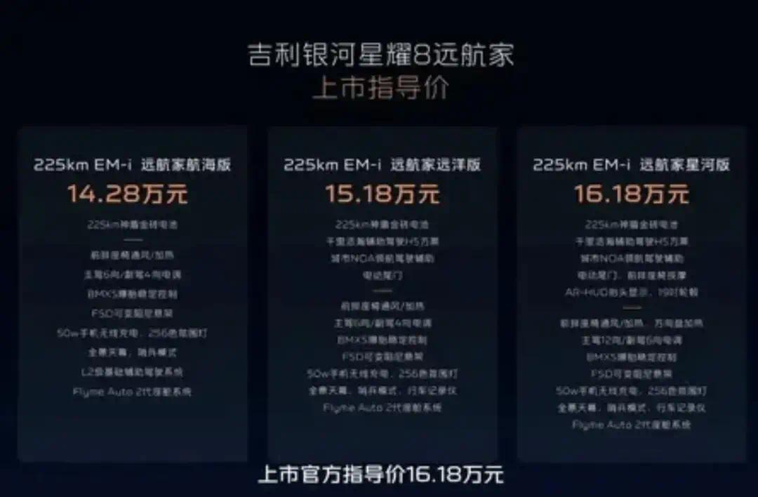 225km EM-i航海版首发价12.98万元起,远洋版13.88万元起,星河版14.88万元起。EM-P星河版+耀夜套装17.28万元起。