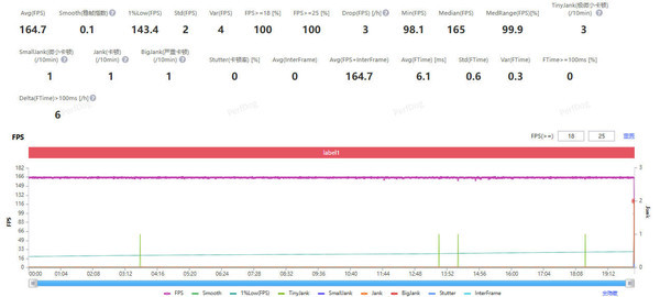 经过实测,在安兔兔V11.1中,我们跑到了 392万分的成绩,这对于天玑9500来说绝对是个好成绩;与此同时,实际游戏时,狂暴引擎针会对底层微架构进行了优化,在SoC调度上了进行调优以得到更好的帧率体验。经过实测,在《和平精英》经典海岛地图下,20分钟平均帧率为164.7,1%Low帧为143.4,上飞机、跳伞、落地整个过程衔接的非常丝滑;并且后续整个“搜打撤”的过程中帧率稳定性表现得非常好,没有感受到画面的卡顿。